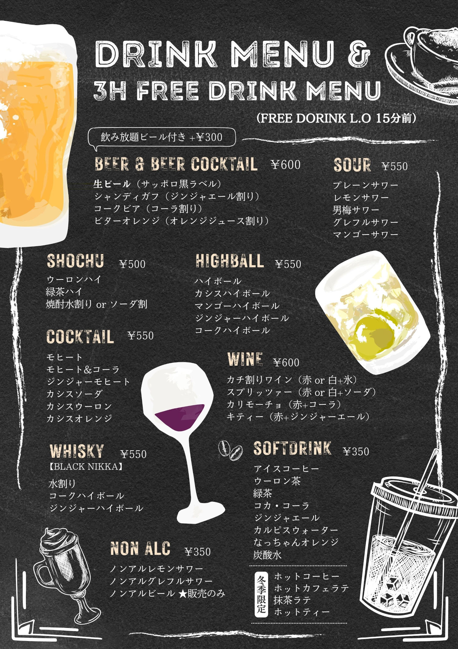ドリンクメニューは下記、ご覧の通り40種以上をご用意しております。